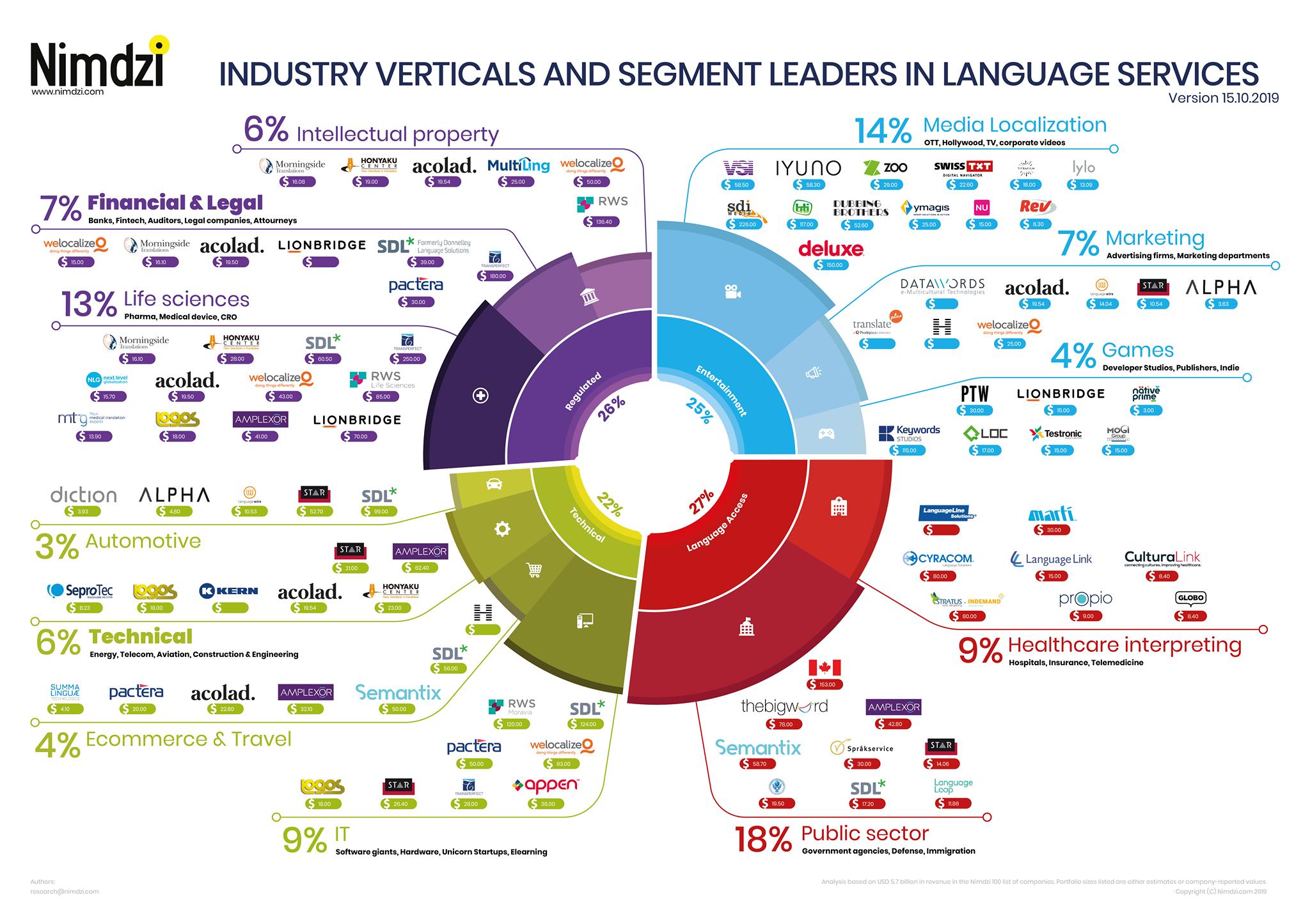 In the China state media, the expert from Fudan University remarks that foreign language and translation students should be directed to law, tech, and finance language and translation tracks. He also notes that few students are studying this. Professor Cai’s reasoning is well supported by industry survey evidence. When Nimdzi studied industry verticals among large LSPs in 2021, it came up with an image that looks like this:
